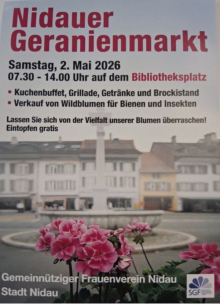 Am Samstag, 2. Mai 2026 findet von 7.30 bis 14.00Uhr auf dem Bibliotheksplatz der Nidauer Geranienmarkt des Gemeinnützigen Frauenvereins Nidau statt. Es gibt Kuchenbuffet, Grillade, Getränke, Brockistand, Verkauf von Wildblumen für Bienen und Insekten, gratis Eintopfen und vieles mehr.